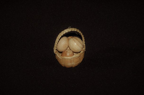 Image: A miniature hand-woven market basket filled with wooden eggs (weaver and carver unknown).